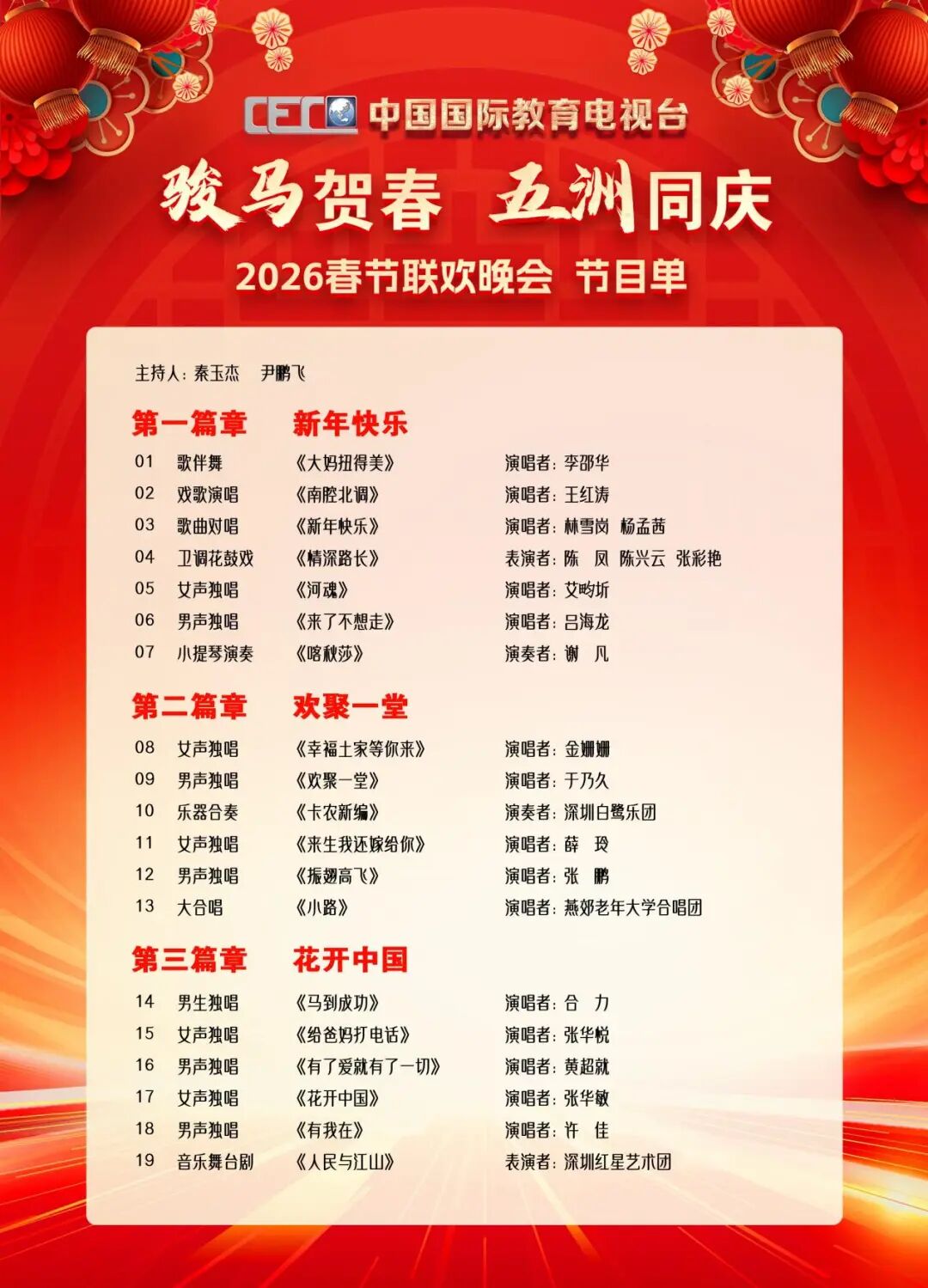 本届“骏马贺春,五洲同庆”2026春节联欢晚会在中国国际教育电视台汉语文化频道春节黄金时间段播出,首播2月19日,1天首重播共5次2:00,重播时间:9:00、12:00、16:00、20:00。届时敬请收看。