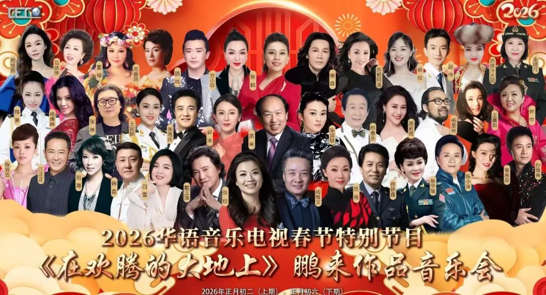 2026华语音乐电视春节特别节目《在欢腾的大地上》鹏来作品音乐会上集,将在中国国际教育电视台汉语文化频道春节档面向海内外播出,首播2月22日,1天首重播共5次2:00,重播时间:9:00、12:00、16:00、20:00。